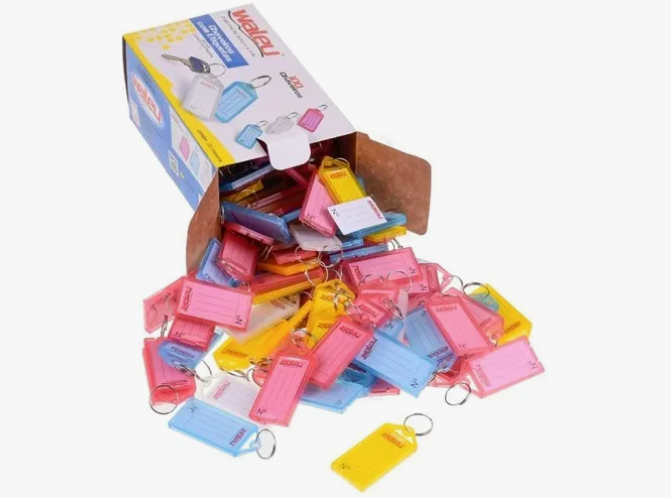 Características: 50 unidades de chaveiros organizadores de chaves com etiquetas coloridas;